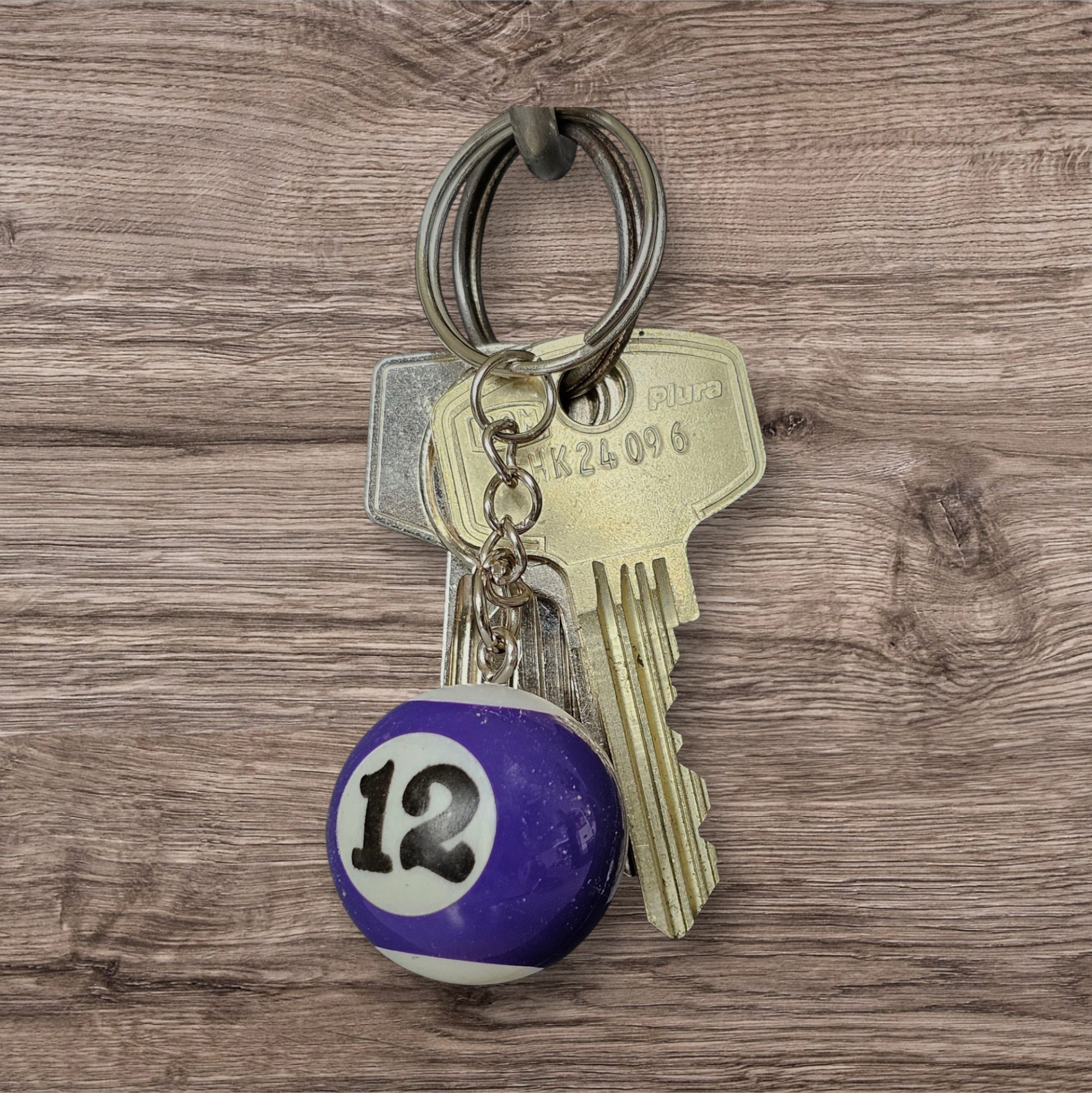 We hebben het hele Poolbiljart in het het assortiment en dit de paarse half bal nummer 12 sleutelhanger.