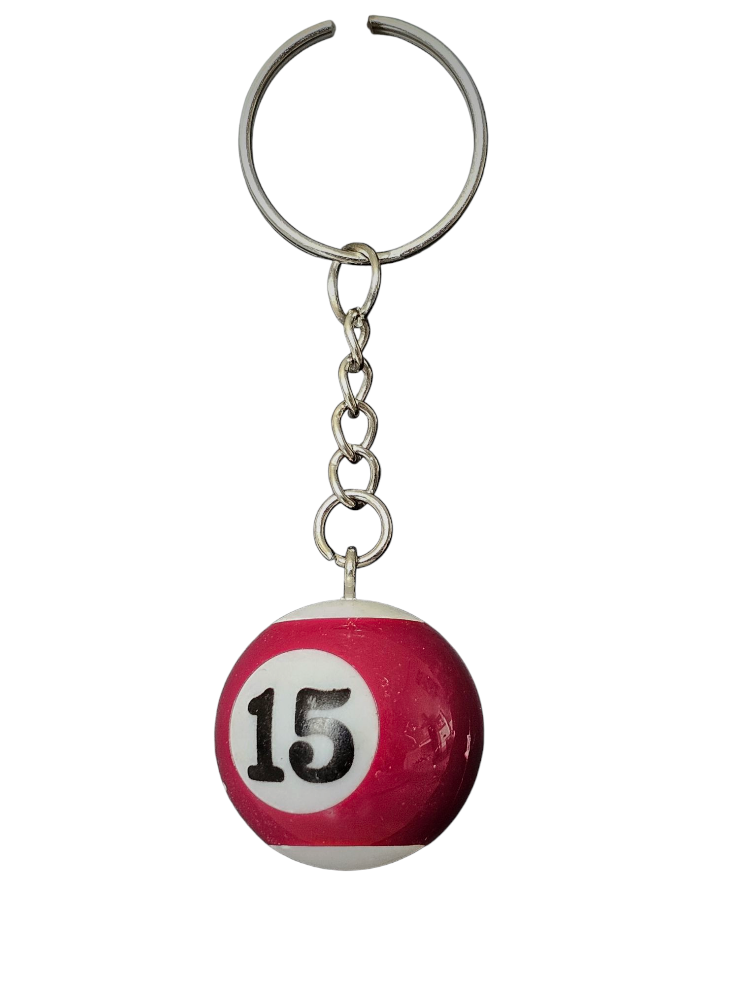 We hebben het hele Poolbiljart in het het assortiment en dit de bordeaux rode half bal nummer 15 sleutelhanger.