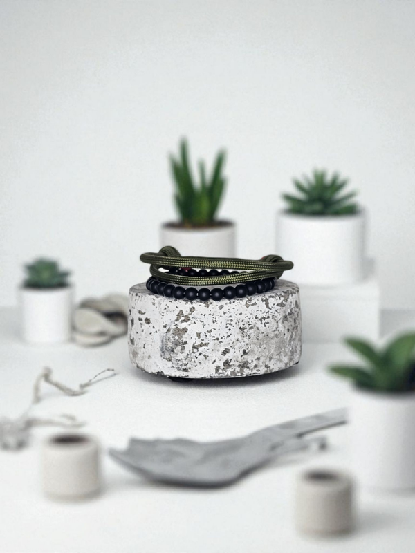 Een mooie 2 delig heren armband, bestaan uit een flexibele lavastenen kralen armband en een mooie in grote verstelbare stoere groene koord armband.