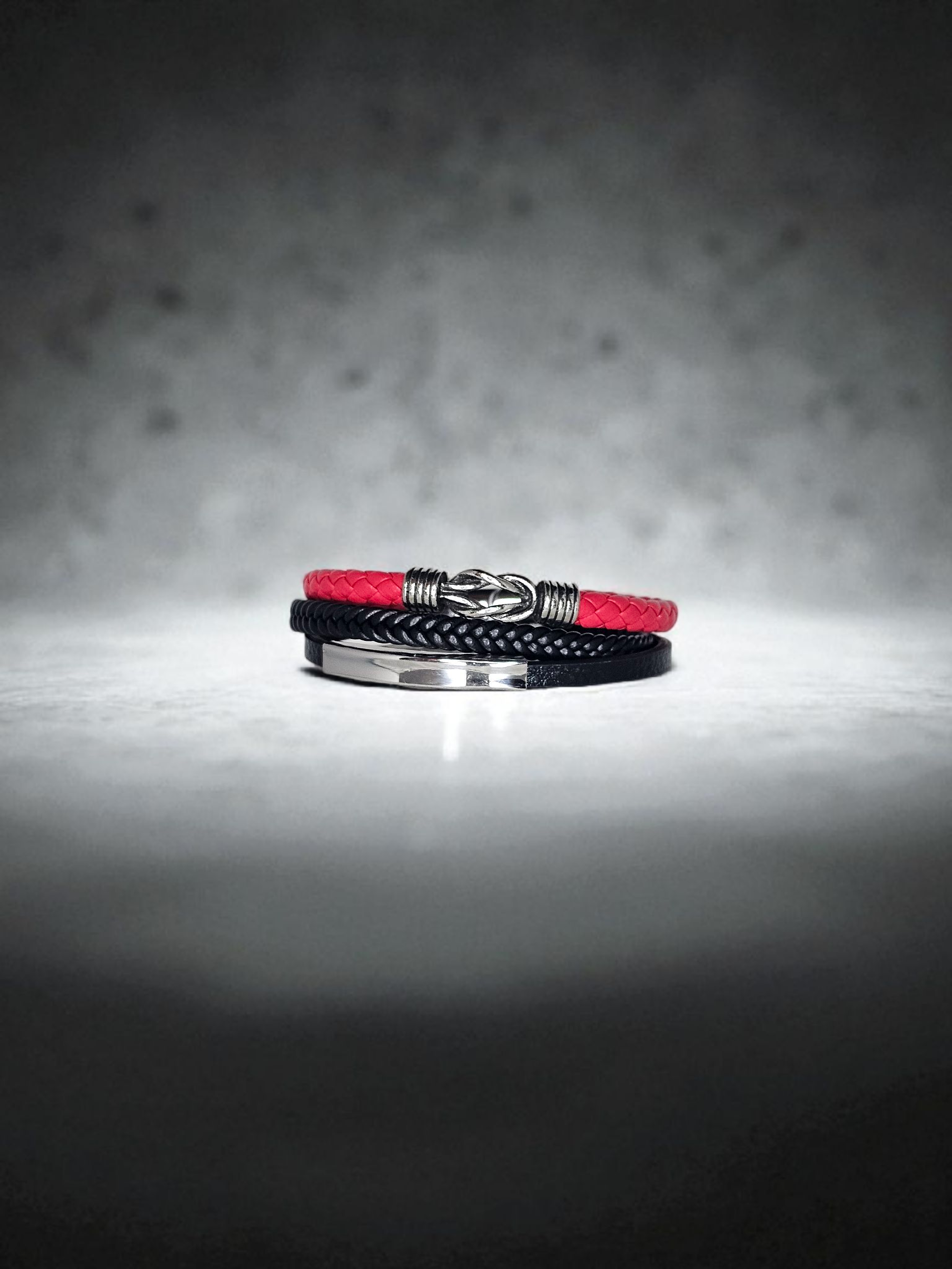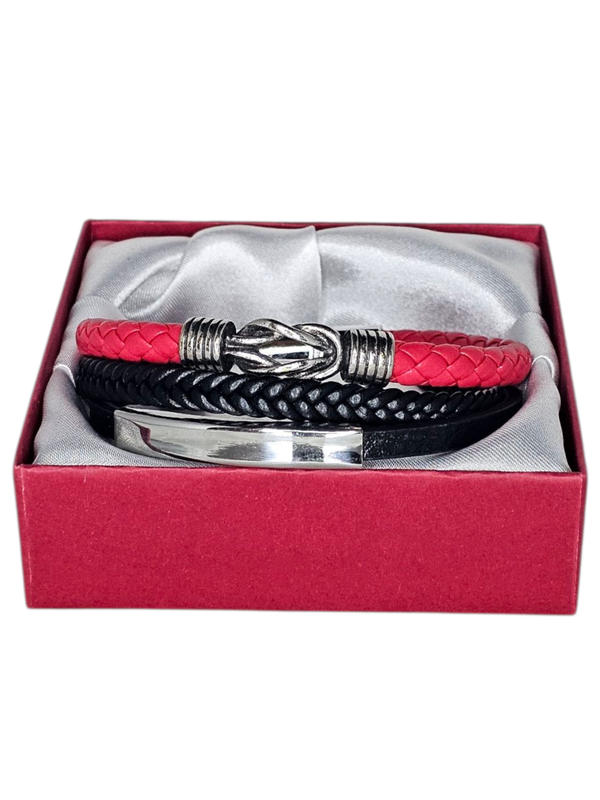 Dit is wel een hele unieke mooie heren armband. Hij bestaat uit een rode band met het oneindig symbool, ronde zwarte leren band en zwarte band met een plaatje die eventueel kan laten graveren (helaas die bij ons) en alles met een zwarte magnetisch sluiting.